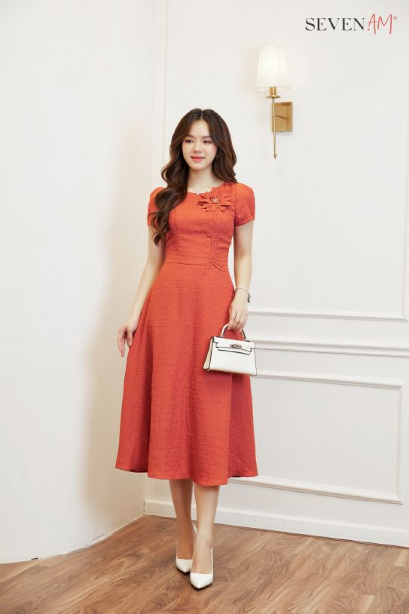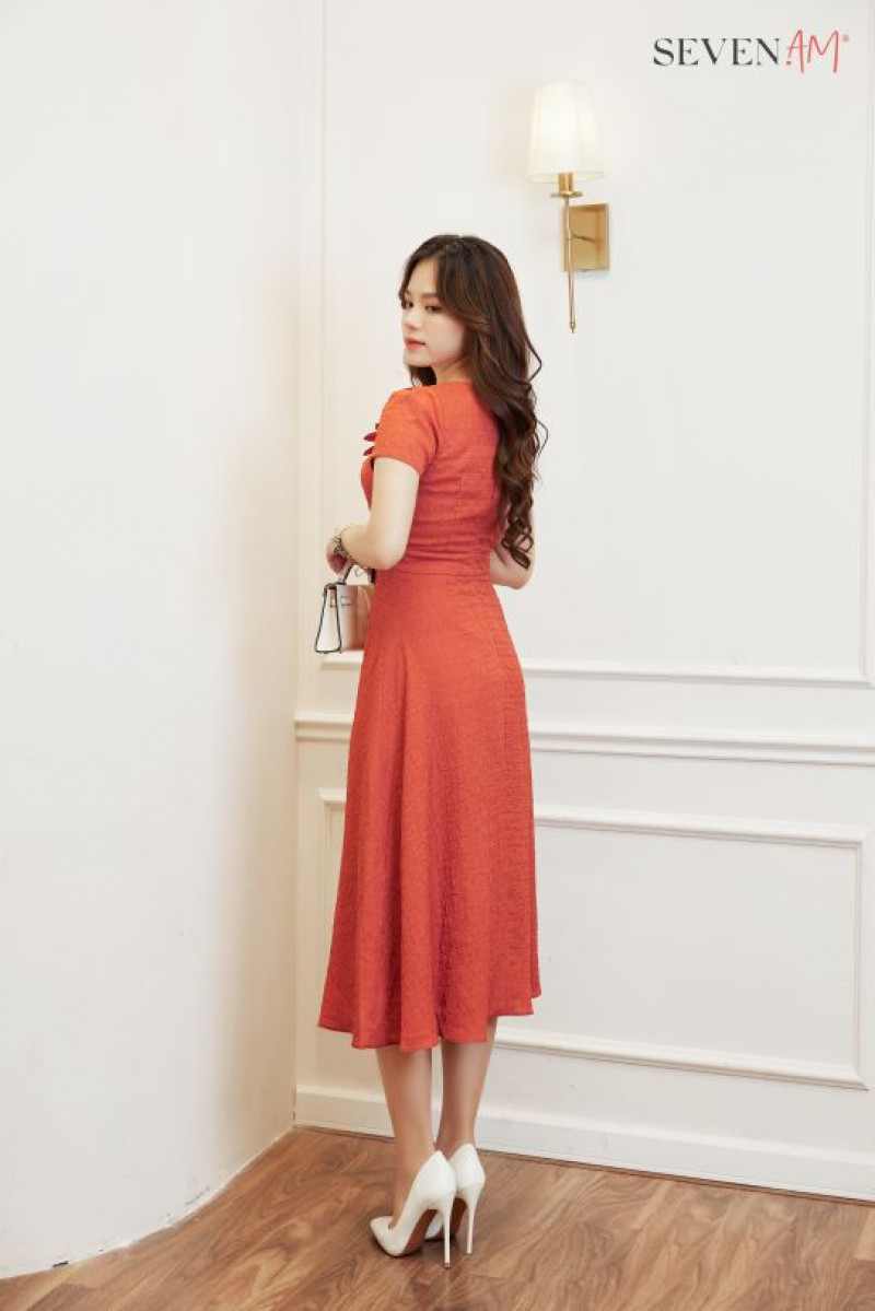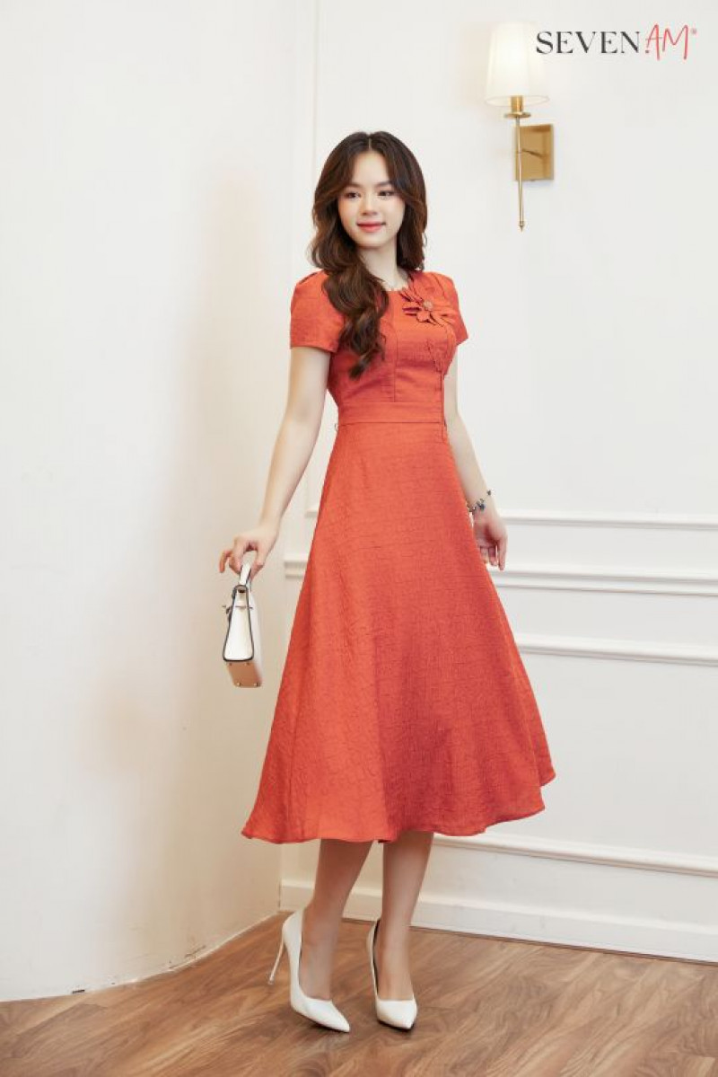 Đầm xòe tay cộc xốp cam cành hoa xếp ly eo Seven.AM H633313D