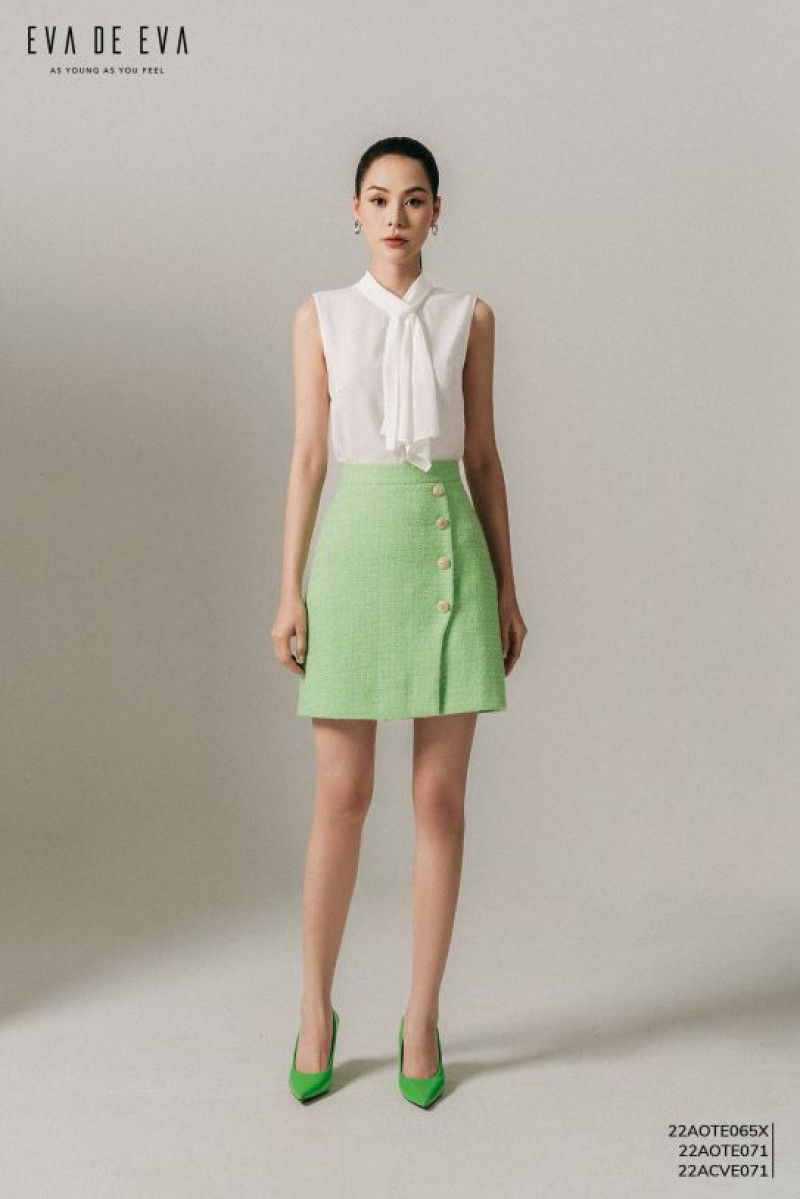 Chân váy A mini có lót quần, tà lệch trang trí cúc trước.Màu sắc: Xanh