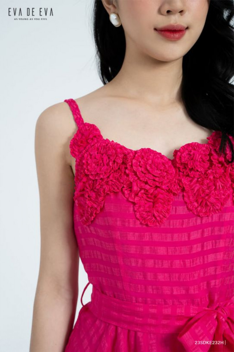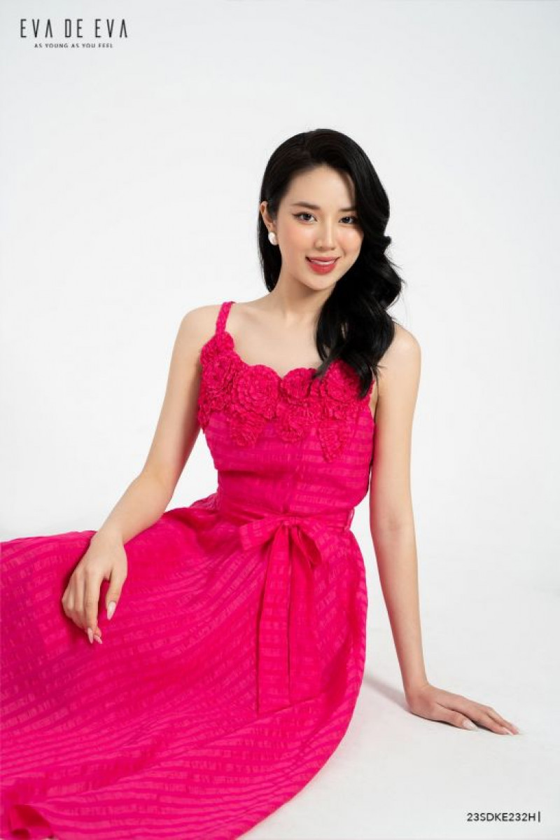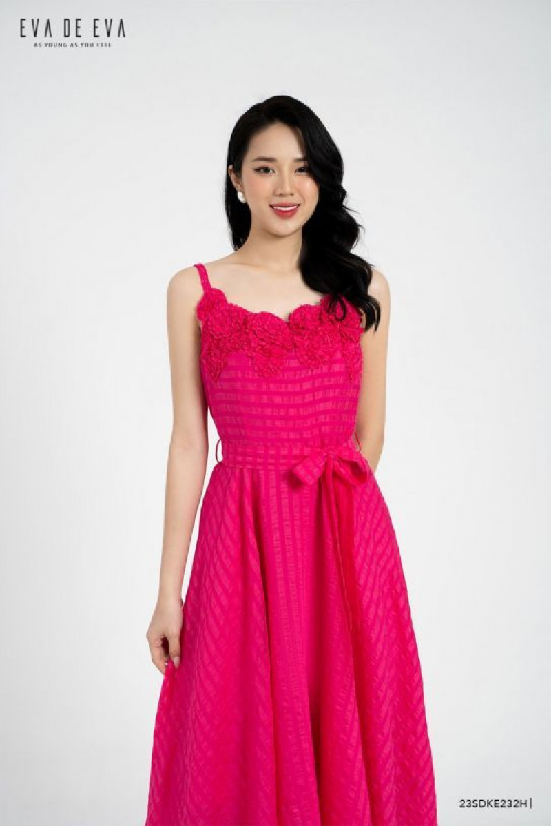 Đầm hai dây, phom dáng xòe, đai thắt eo, chi tiết trang trí hoa nổi làm điểm nhấn.