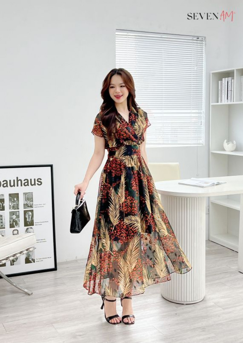 Đầm xòe tay cộc sifong đen lá vàng hoa cam Seven.AM