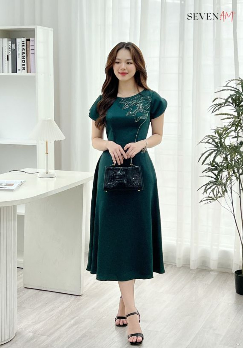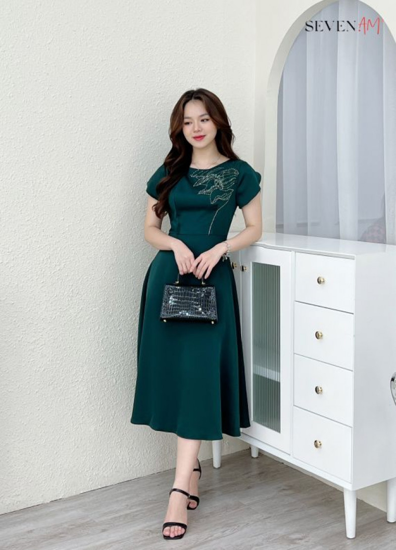 Đầm xòe tay cộc thô xanh đính cườm vai Seven.AM