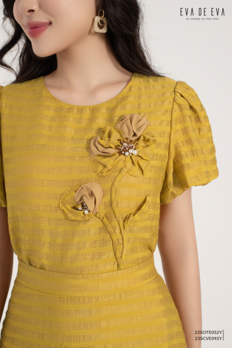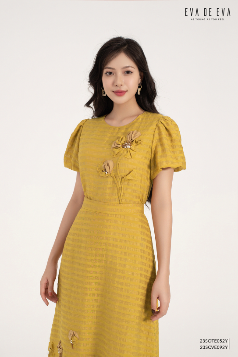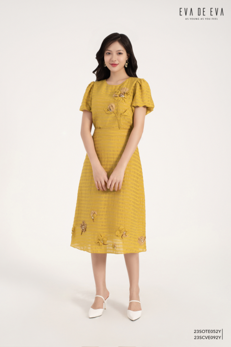 Chân váy midi, phom A xòe basic, độ dài ngang gối, chi tiết trang trí đắp hoa 3D nổi tạo điểm nhấn.