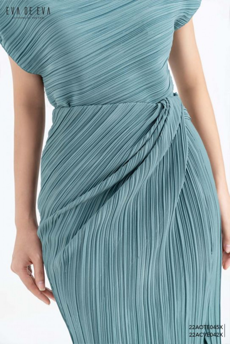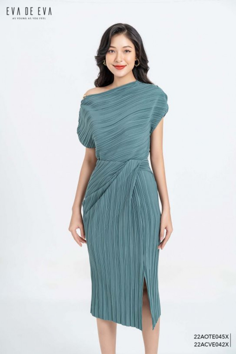 Chân váy dáng suông, tà xẻ lệch bên hông, chi tiết xoắn vặn bất đối xứng tạo điểm nhấn