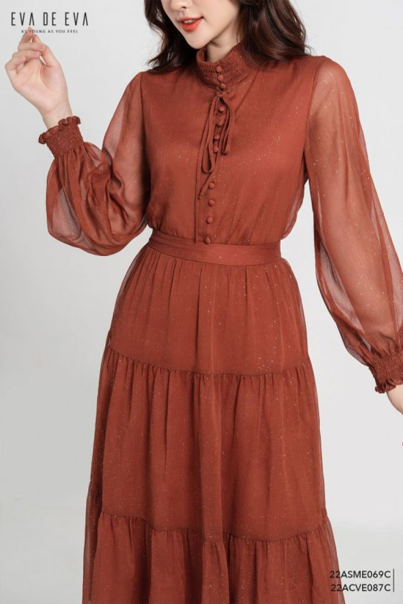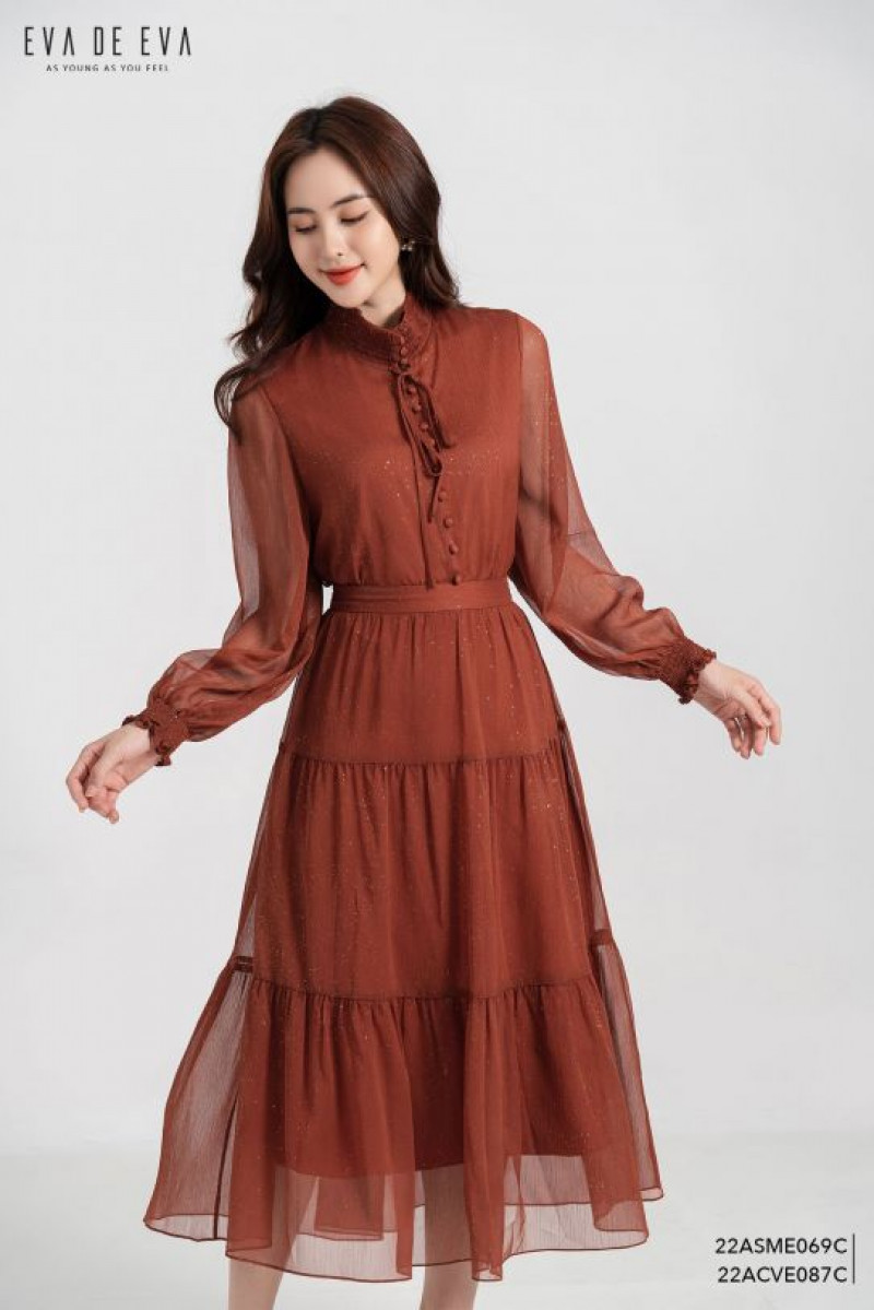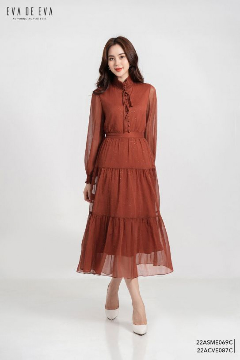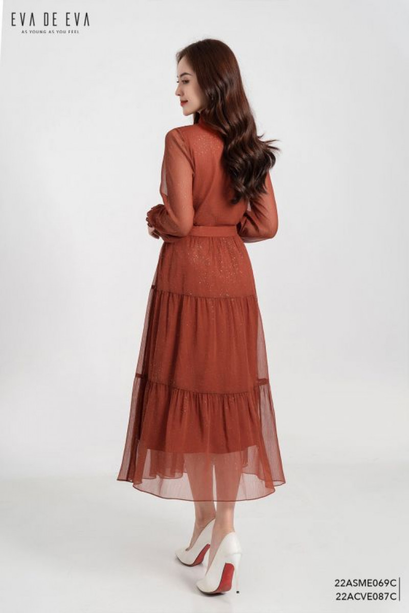 Chân váy midi dáng xòe, bèo nhún 3 tầng.Màu sắc: Cam