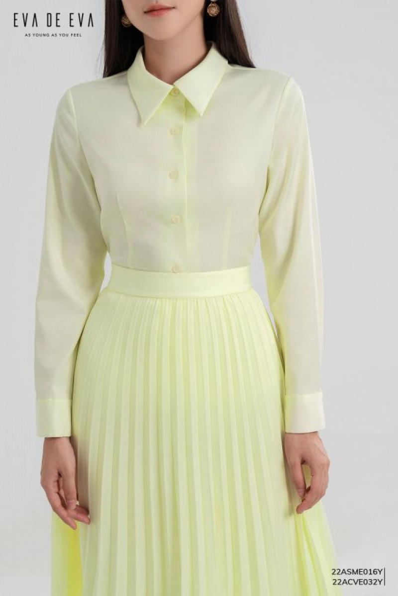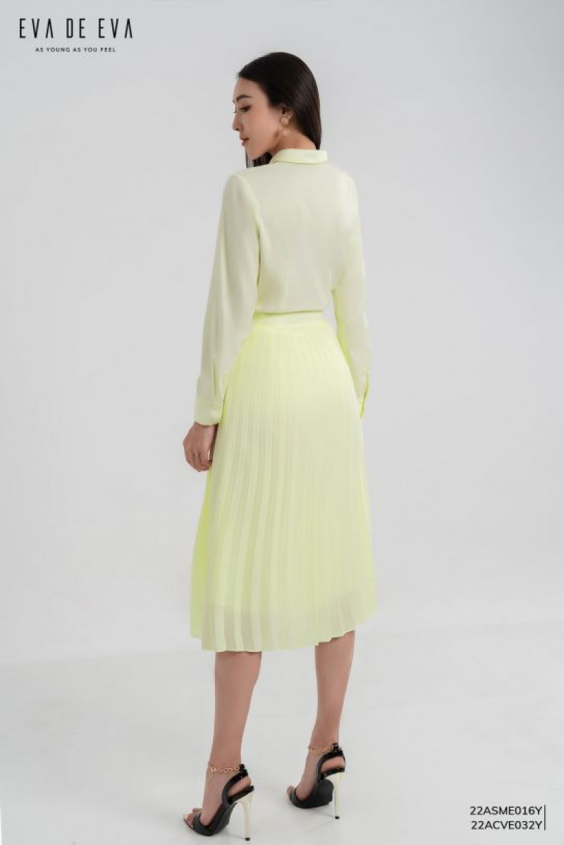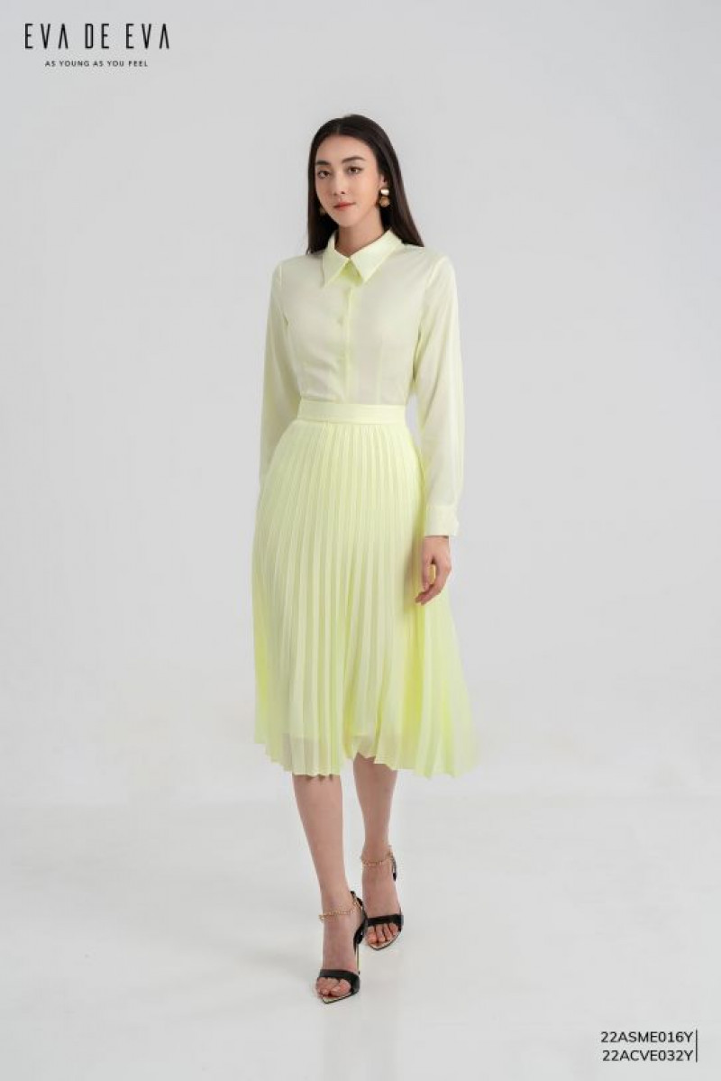 Chân váy midi xếp ly bay bổng, có thể kết hợp với áo sơ mi cùng tone hoặc áo phông trắng.