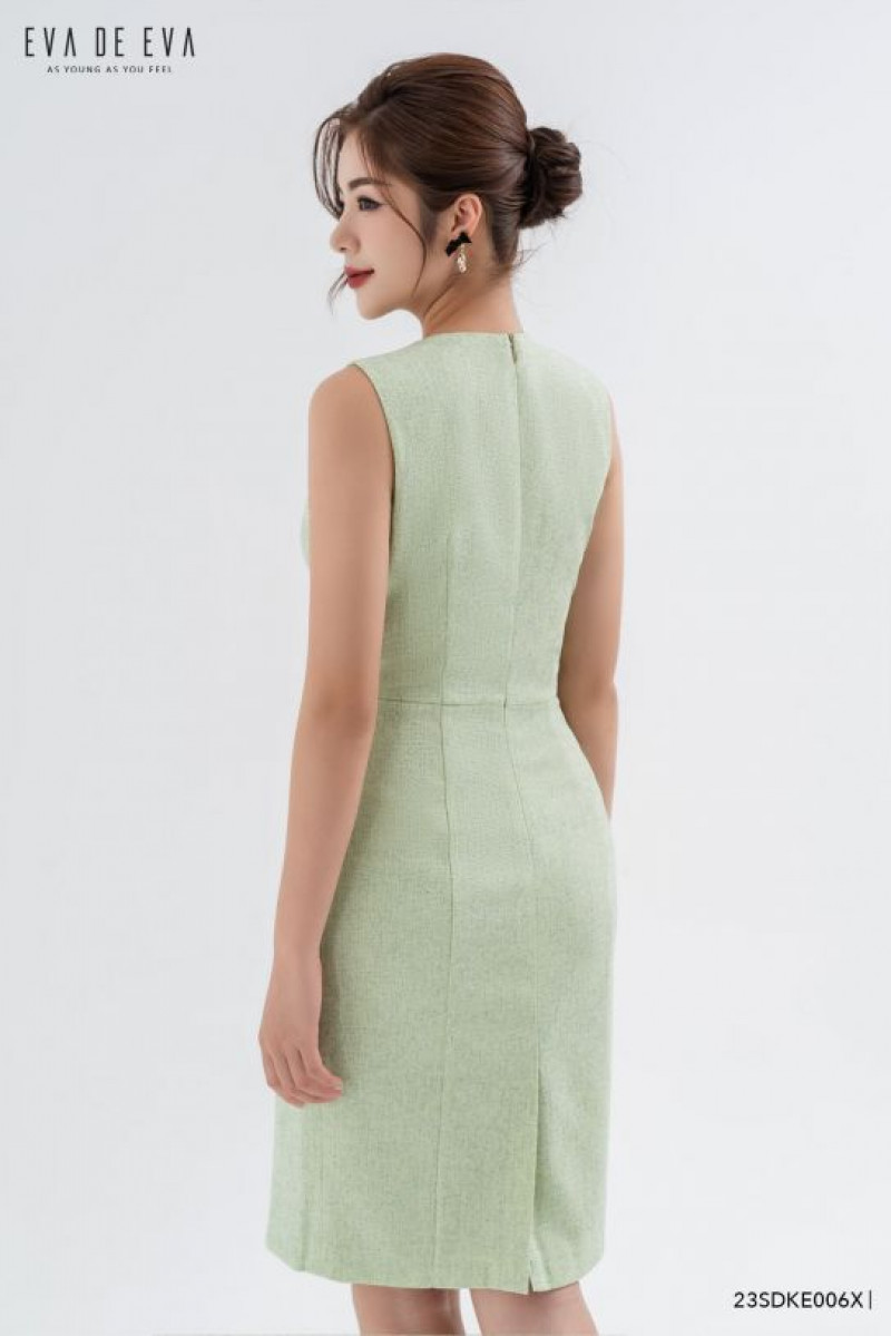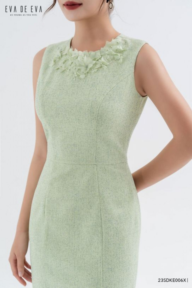Đầm sát nách, dáng ôm và chiết eo tôn dáng, chi tiết hoa văn viền cổ tạo điểm nhấn nữ tính Màu sắc: Xanh