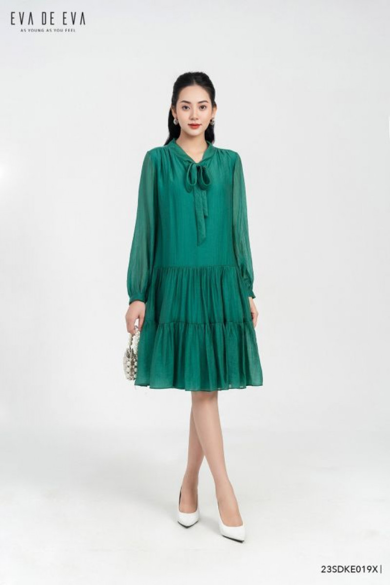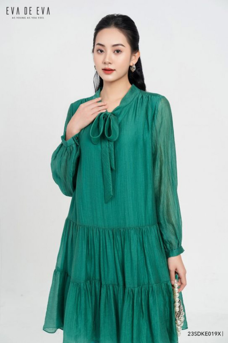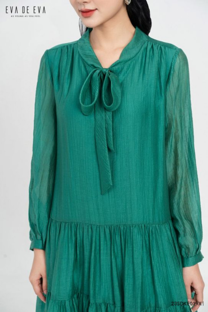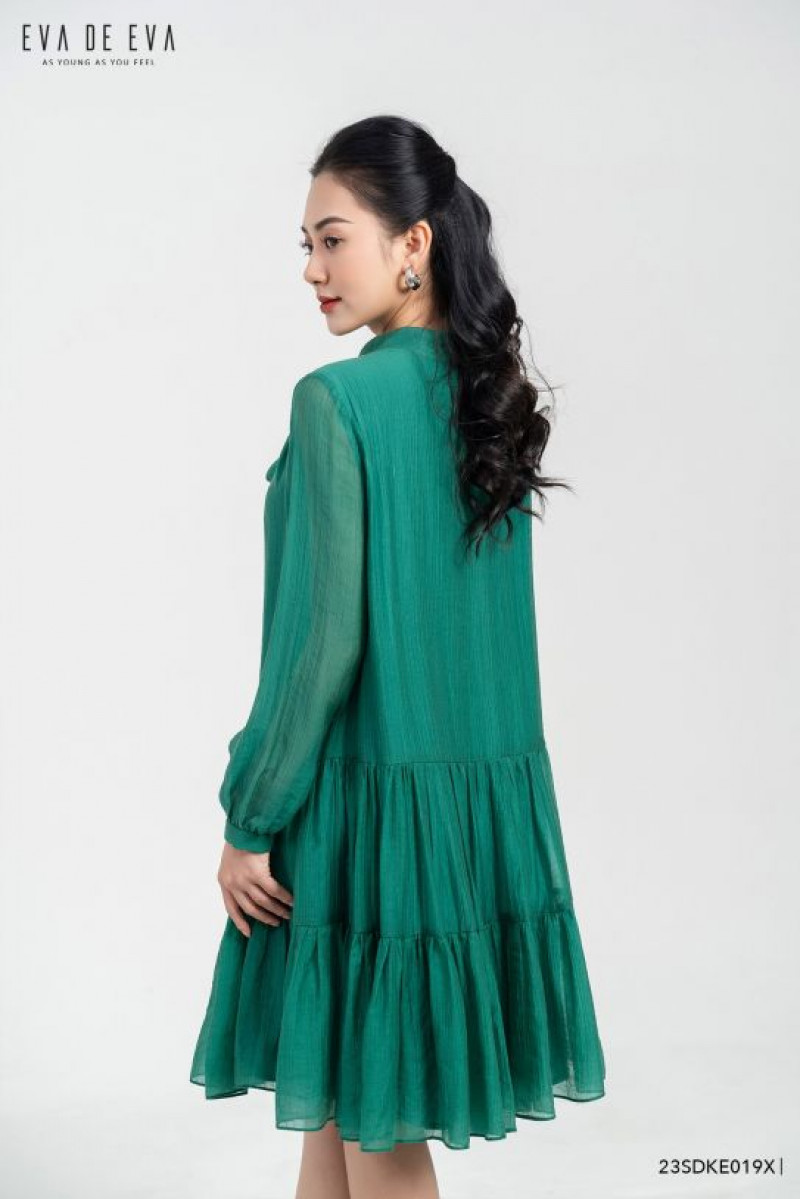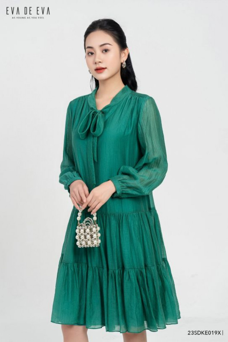 Đầm dáng suông xòe xếp tầng, tay lỡ, cổ có chi tiết nơ buộc cách điệu