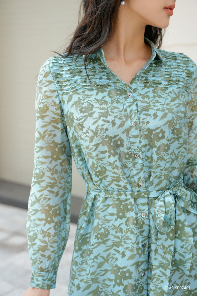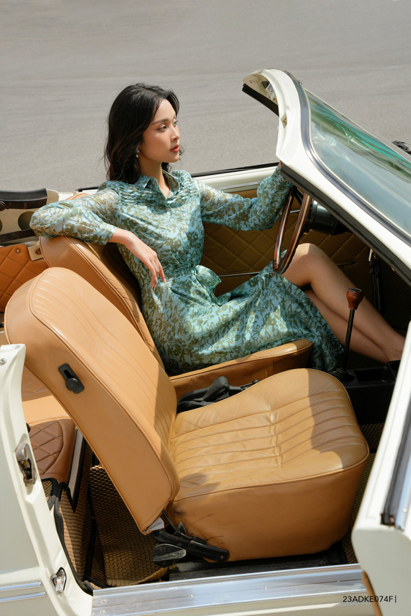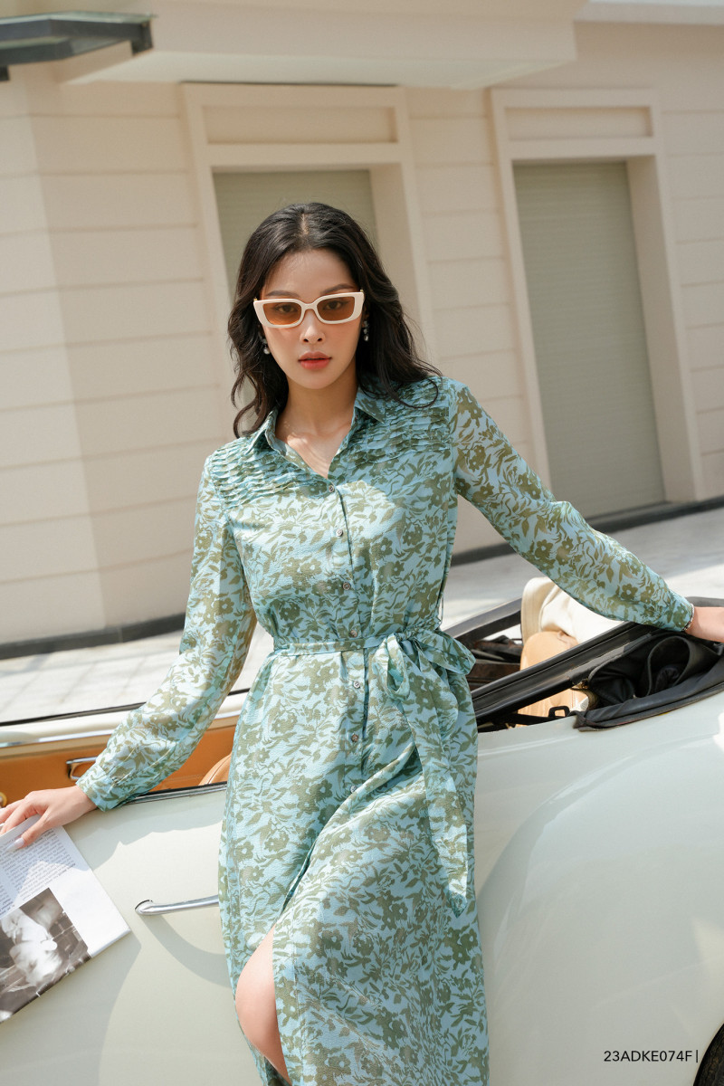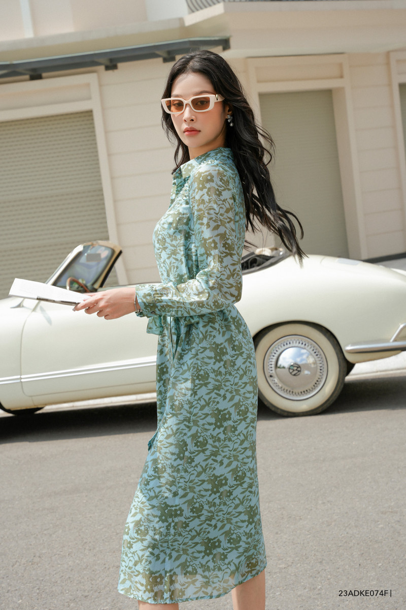 Đầm tay lỡ thắt eo in họa tiết hoa, dáng xòe nữ tính