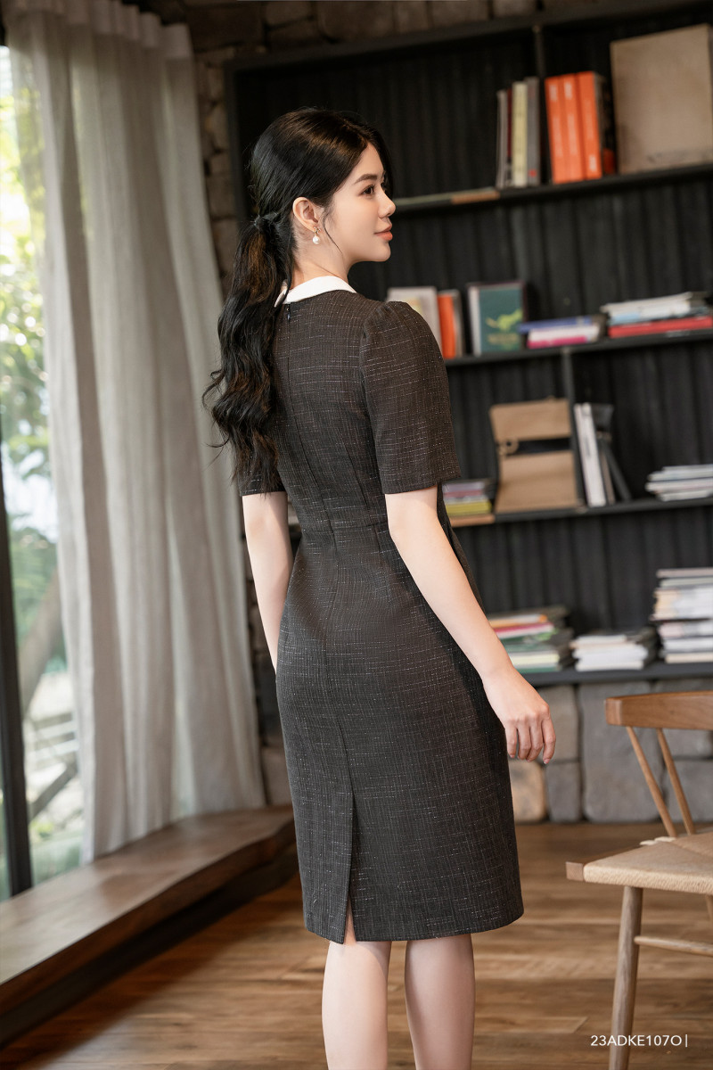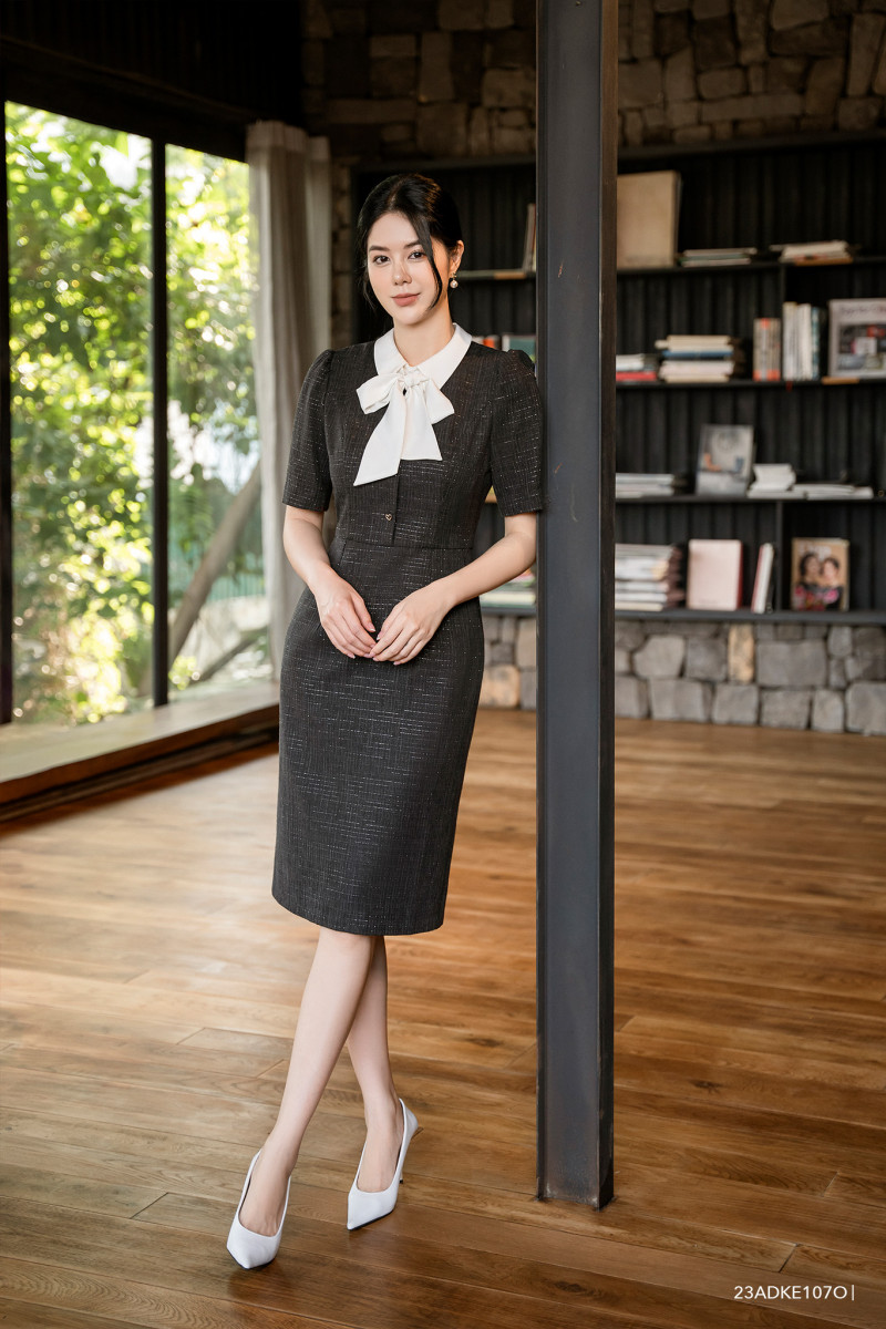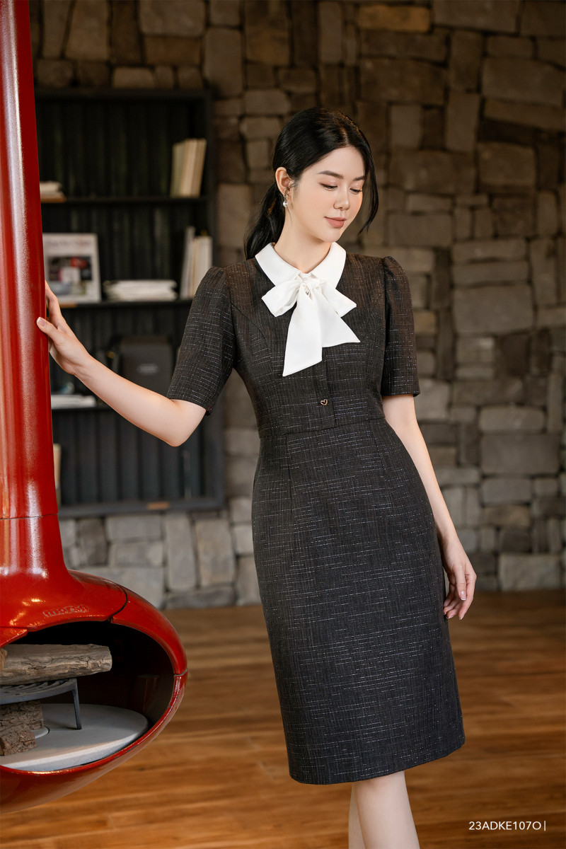 Đầm tweed tay ngắn, dáng ôm cổ phối nơ nữ tính