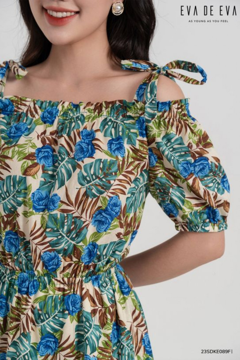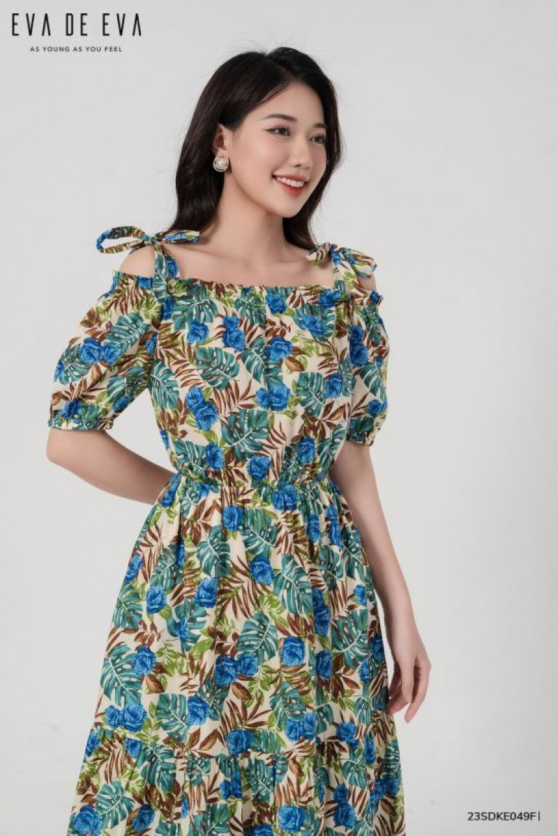 Đầm trễ vai cài chun, có chi tiết thắt nơ ở phần vai, phom ôm xòe midi, tay cộc bo chun nhẹ.