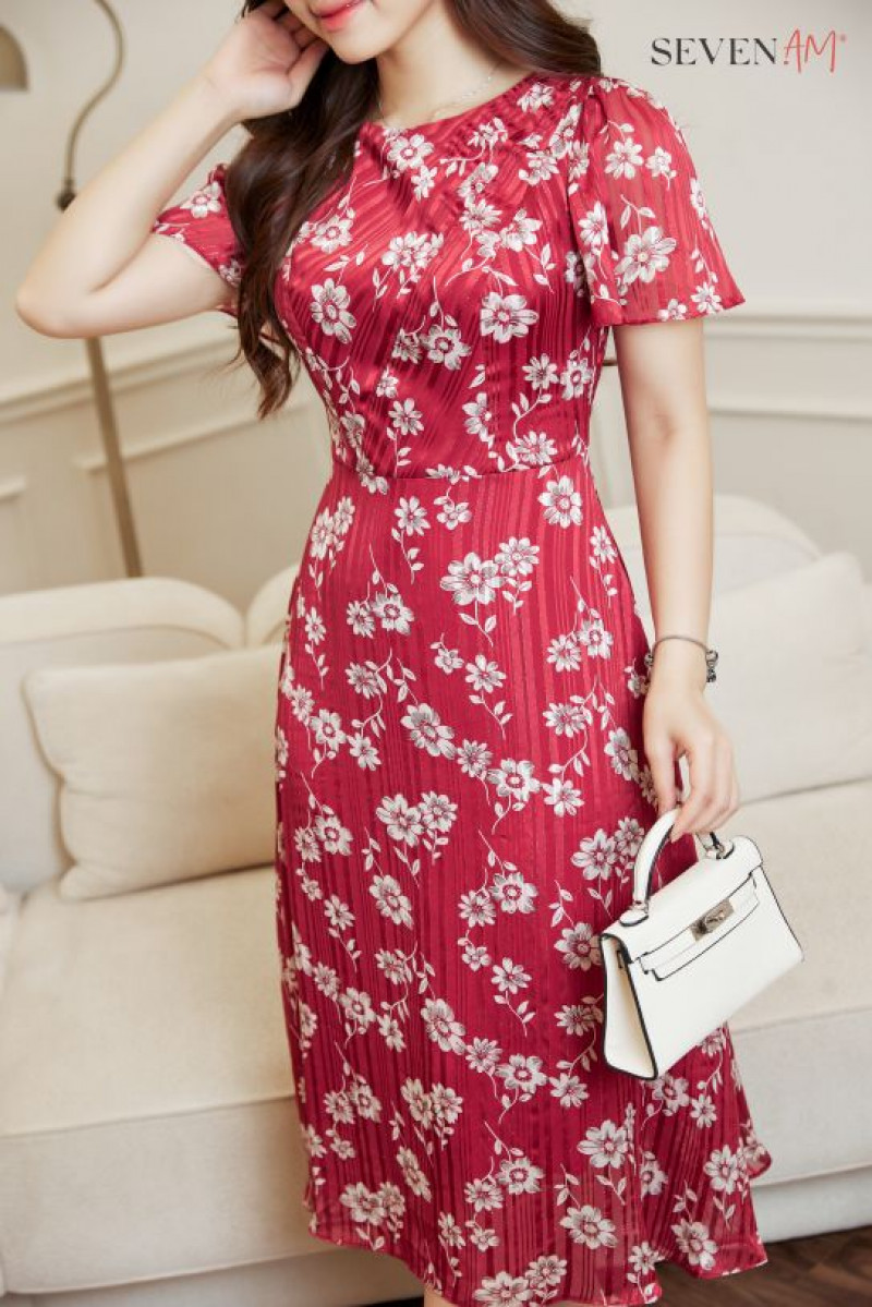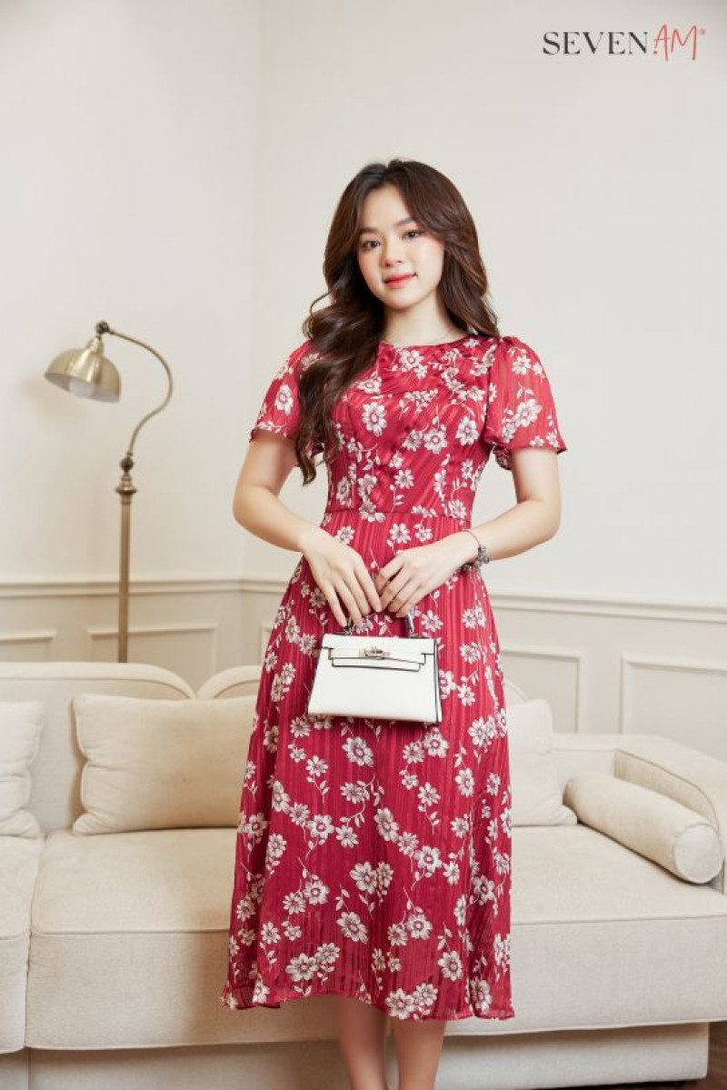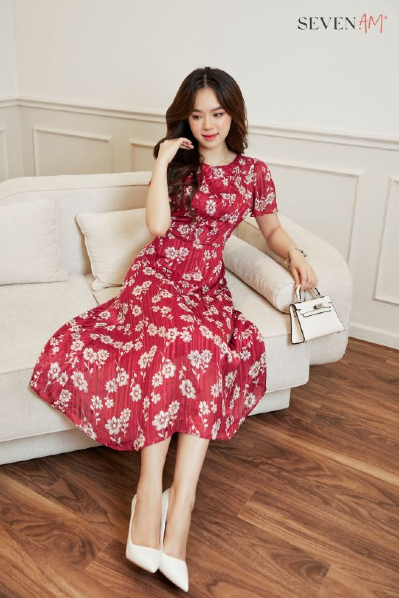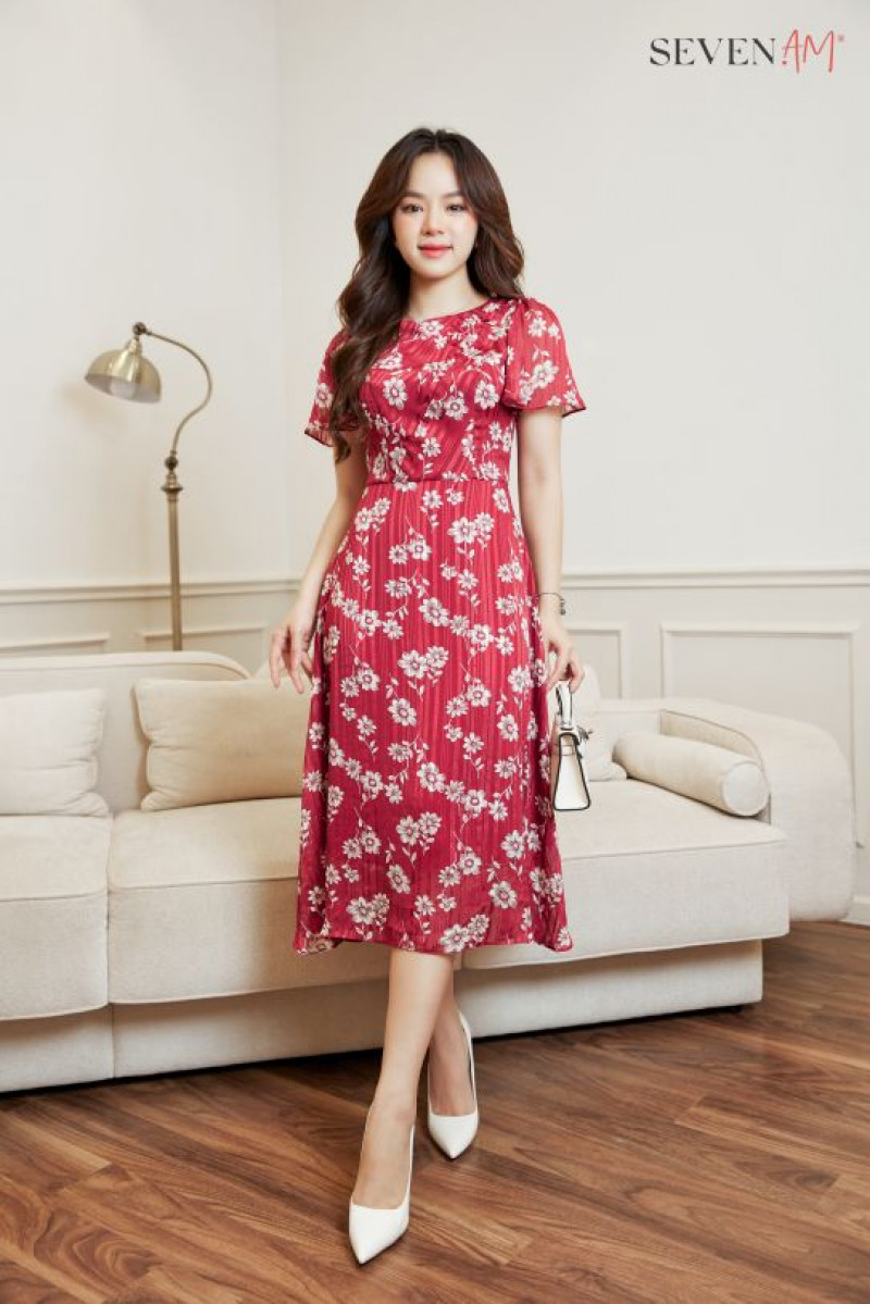 Đầm xòe tay cộc sifong đỏ kim tuyến hoa trắng Seven.AM H633303D