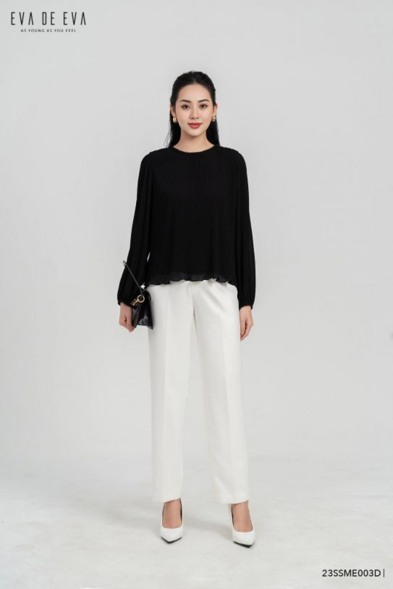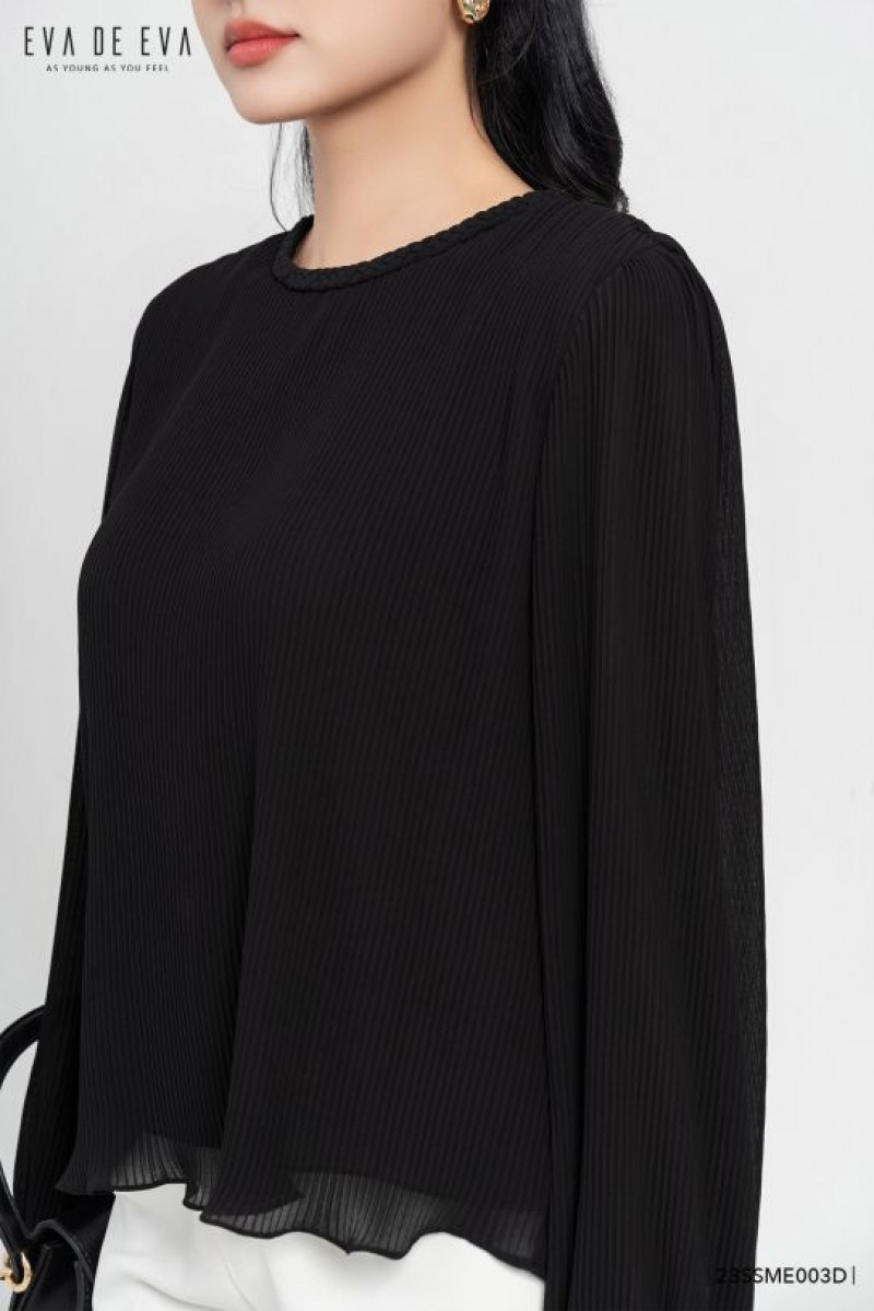 Sơ mi tay dài, phom dáng suông, có bèo nhún nhẹ xếp quanh ngực và ống tay Màu sắc: Đen