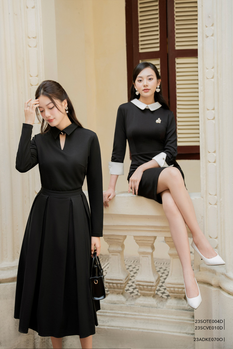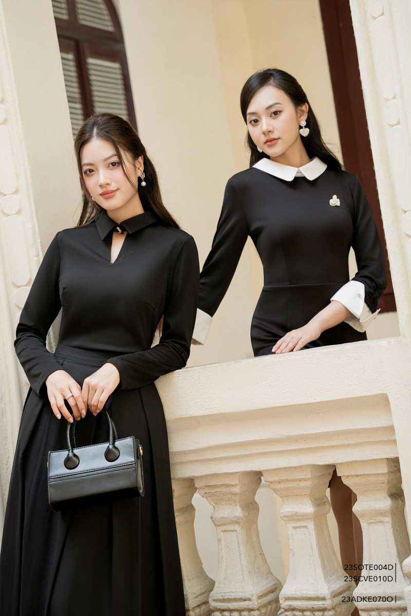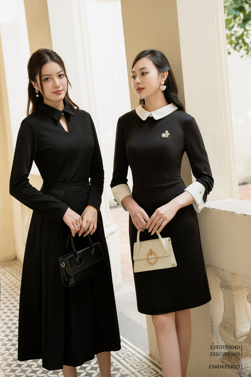 Đầm tay lỡ, phối màu cổ và ống tay, chiết eo tôn dáng
