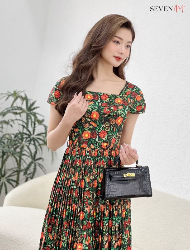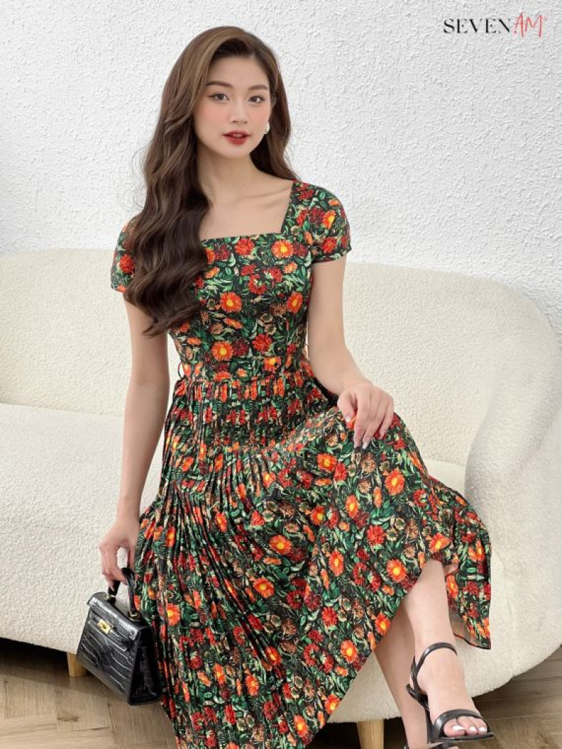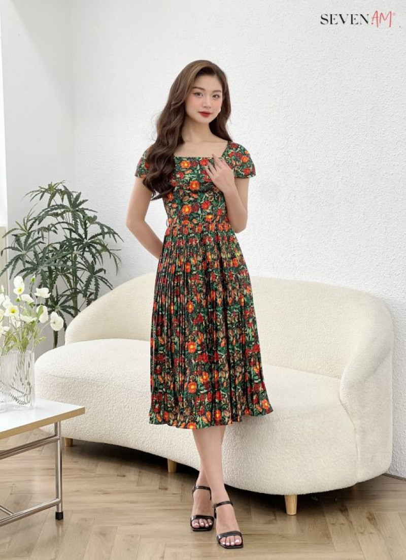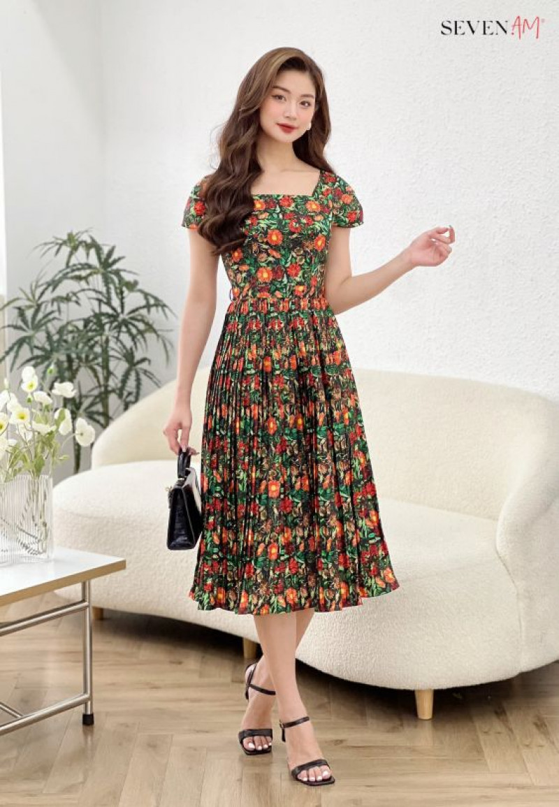 Đầm xòe xanh hoa cam vàng xanh dập ly cổ U thời trang nữ Seven.AM