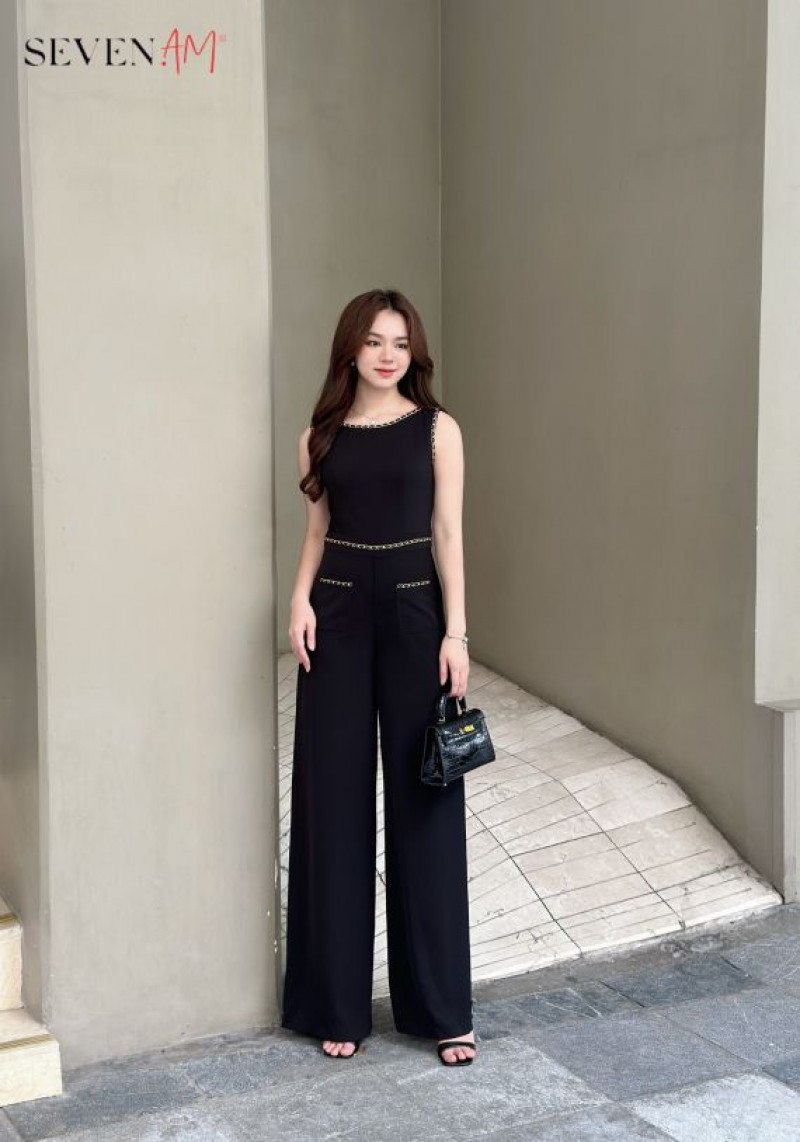 Jumpsuit dài ngắn tay đen cổ ngang dây xích thời trang nữ Seven.AM