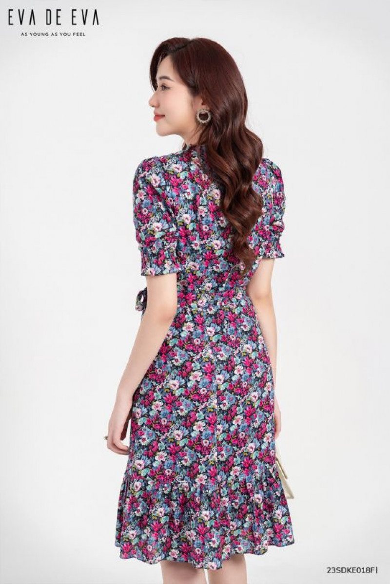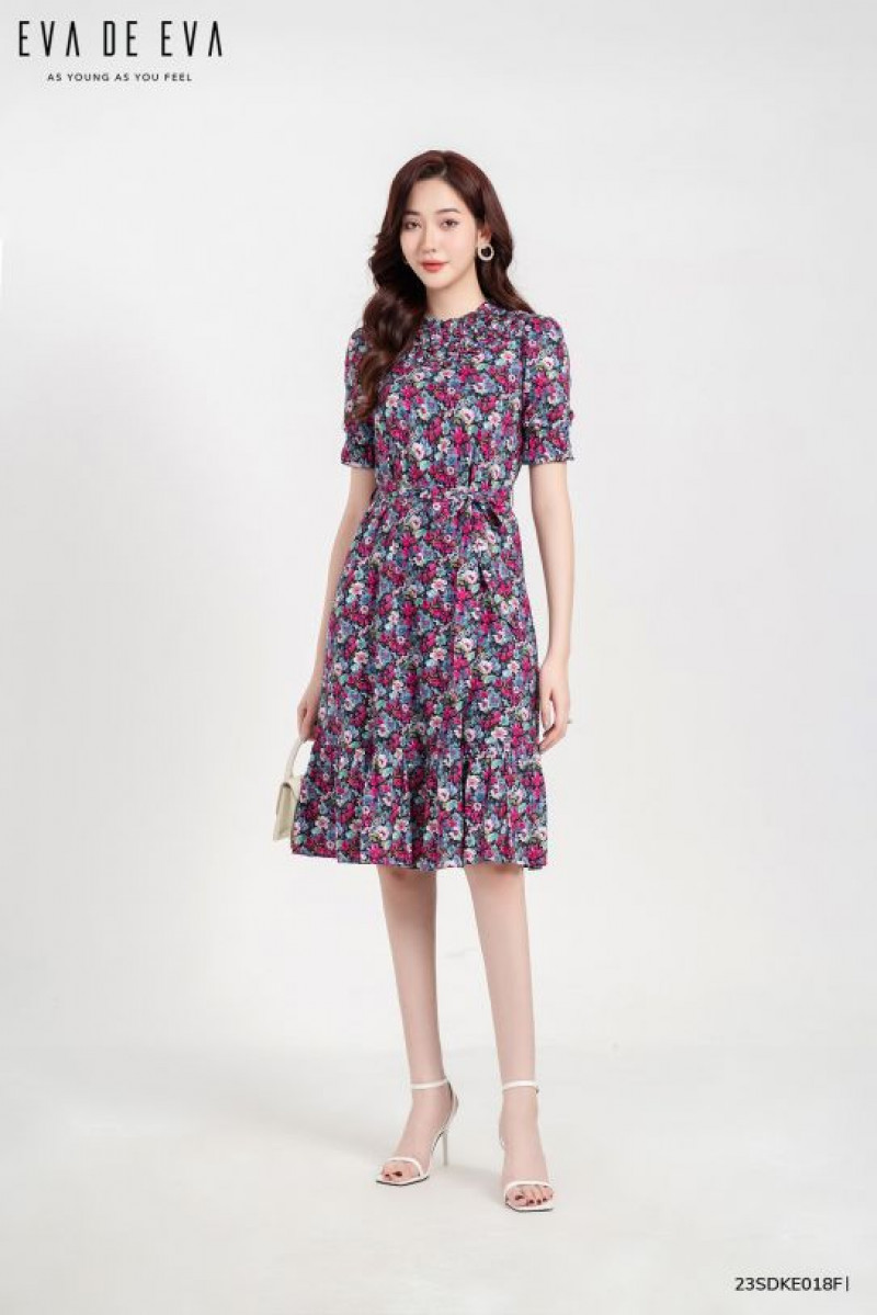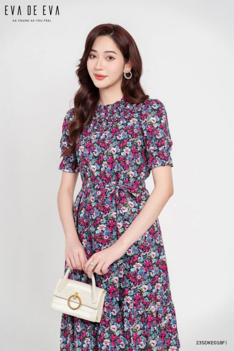 Đầm dáng ngắn, tay bồng điệu đà, trang trí thân trước, có chi tiết dây nơ thắt eo Màu sắc: Họa tiết